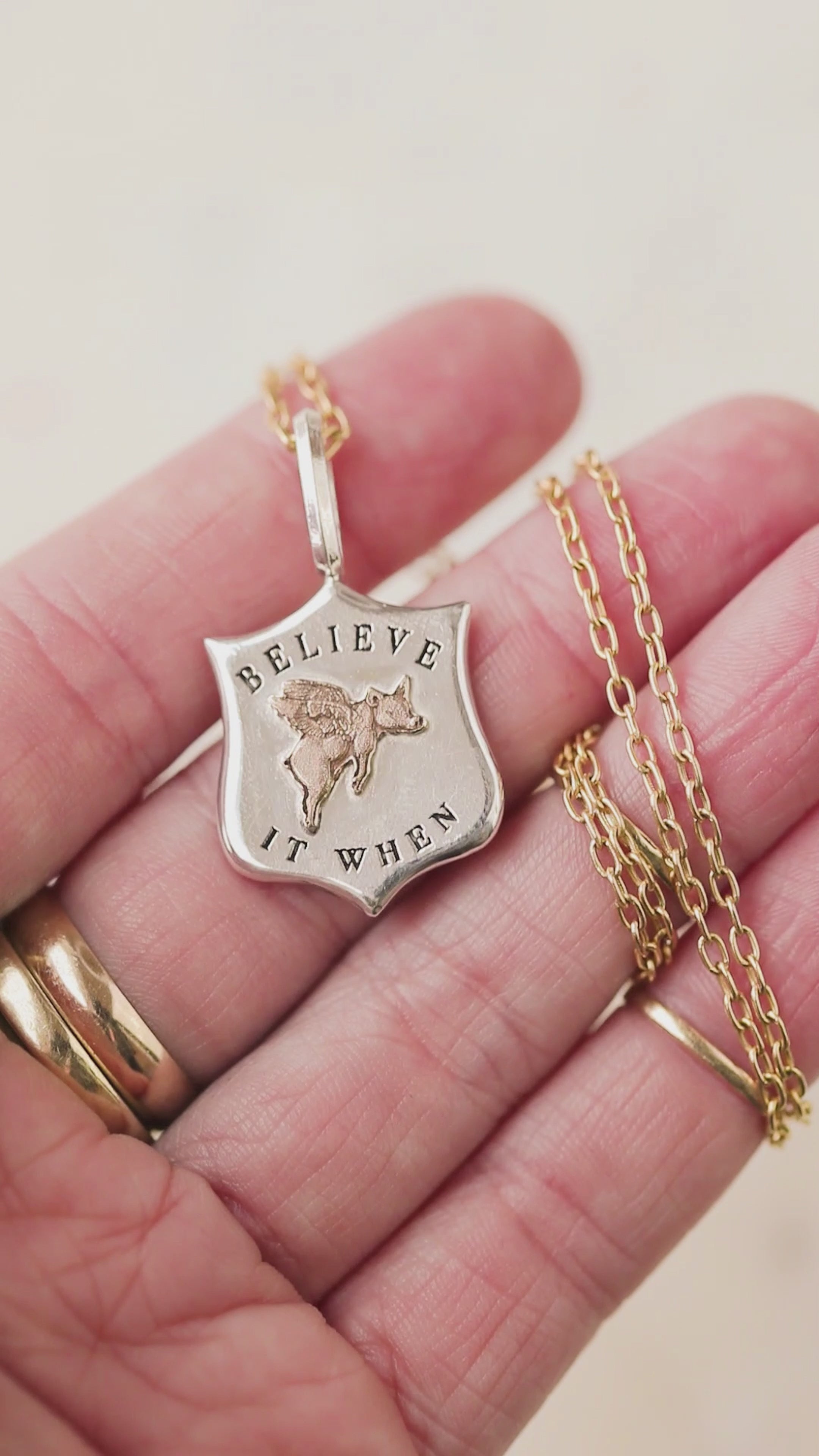 Our solid sterling silver and gold "Believe It When" medallions are proudly crafted by hand in our Nashville studio as a limited edition of 50 pendants. A solid 14k gold winged pig is framed on the front of our Large Elias Medallion. Once the entire edition of 50 pendants sell through, they'll officially all be gone, and we'll never make another. Each charm is numbered on the back.