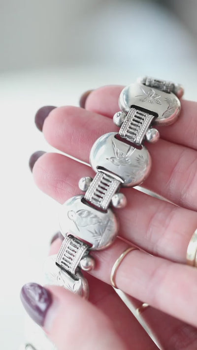 This sterling silver necklace measures 18' with a 2.5" drop down. The pendant measuring 1" in width and 1.5" in height.