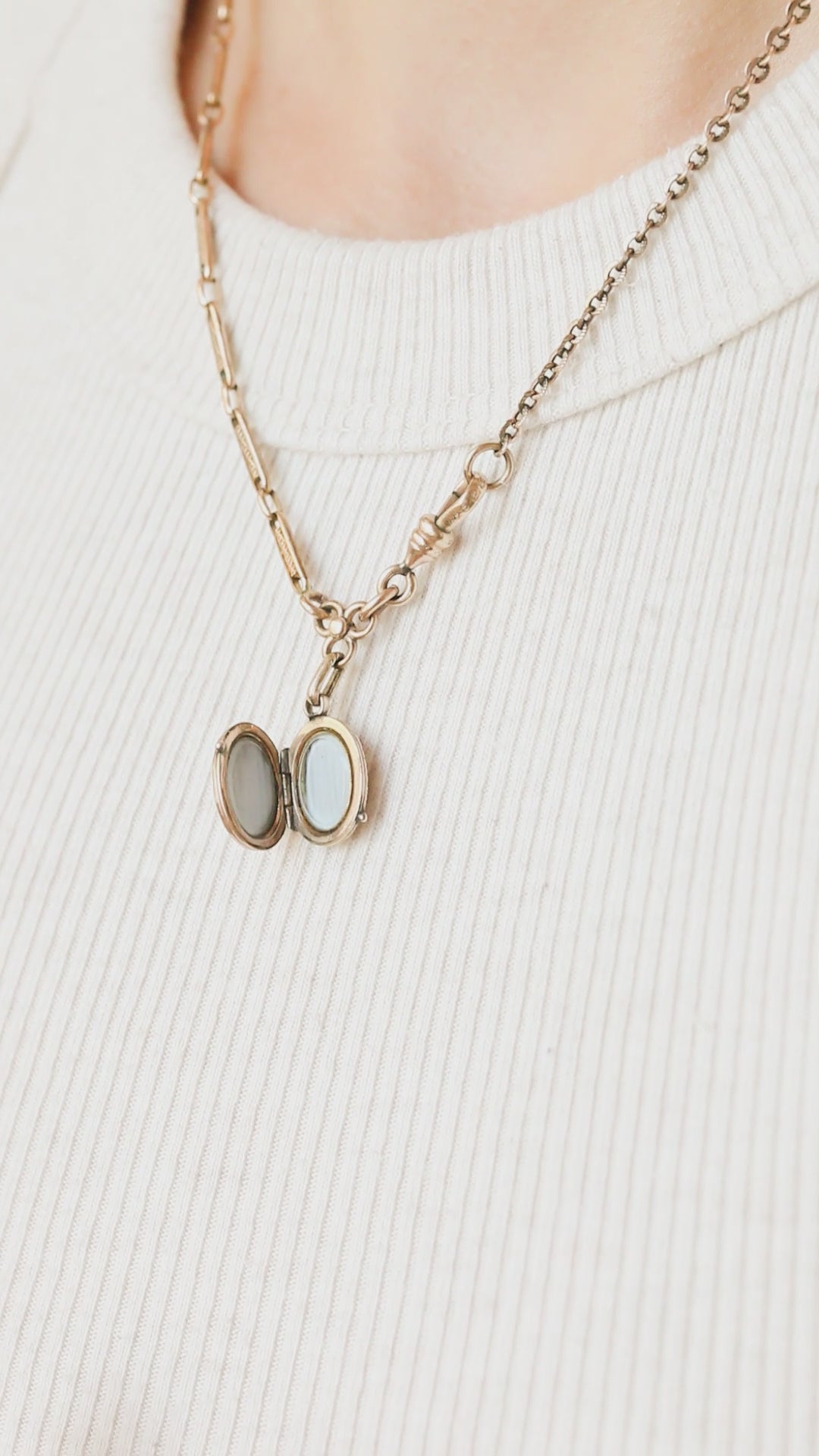 This necklace measures a standard 17” on an antique 9k gold chain with the locket measuring .5" in length.