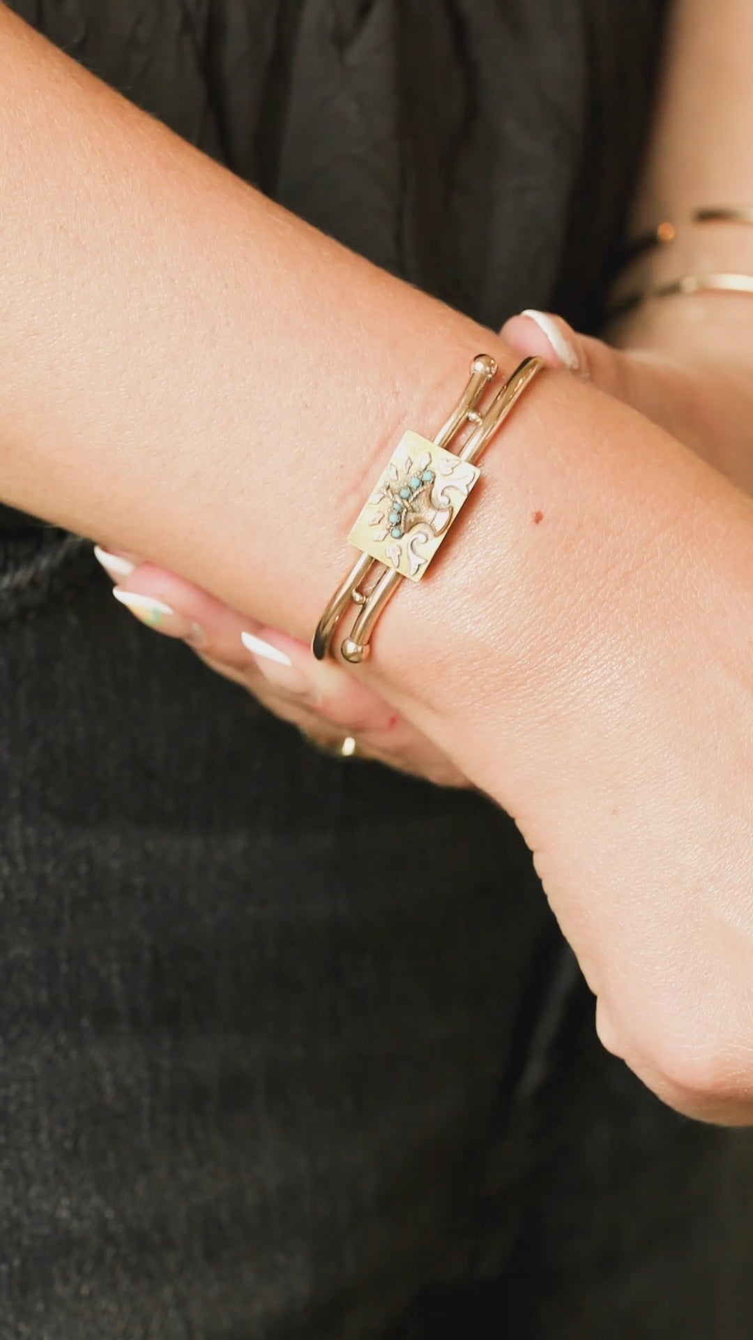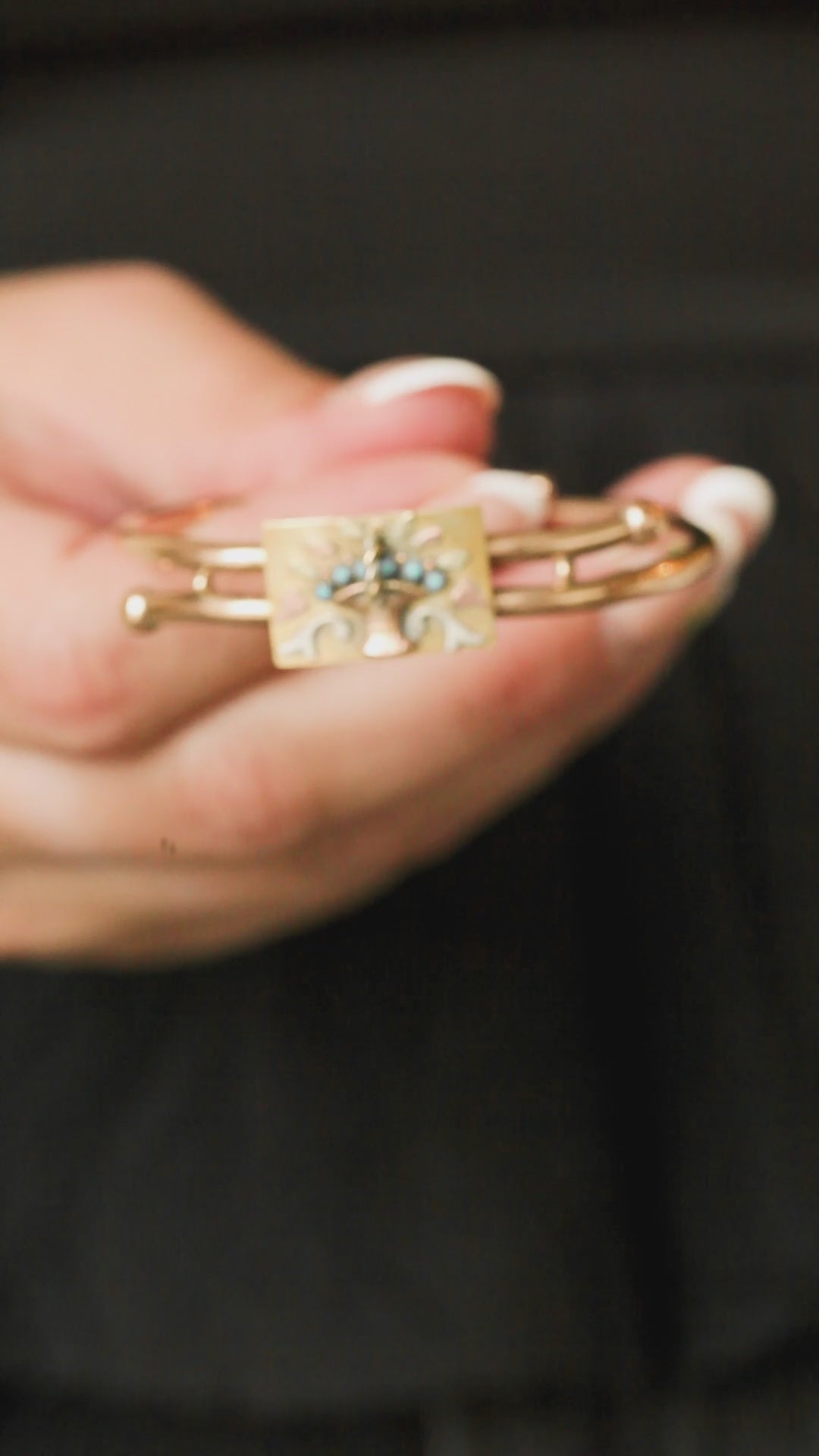 This restored Victorian engagement bracelet features gold filled, floral design with turquoise stone details. Engagement bracelets come from a tradition centuries ago in which a groom would present his future bride with a set of bracelets: one to be worn at the beginning of their engagement and the second to be put on the day of her wedding. Women would often pass these down from daughter to daughter.