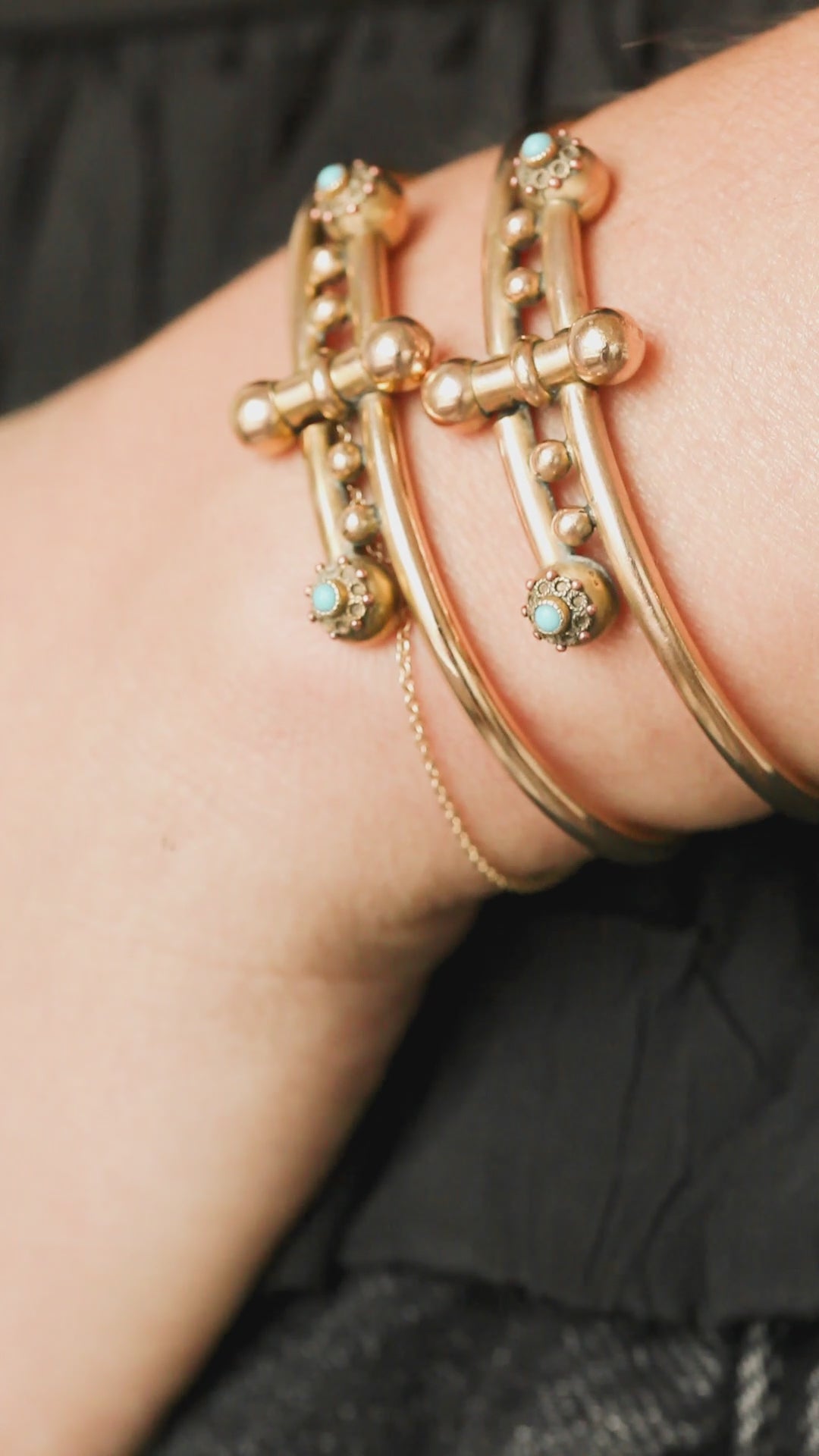 This restored pair of Victorian engagement bracelets feature gold filled Etruscan design and turquoise stone details. These gold filled bracelets come from a tradition centuries ago in which a groom would present his future bride with a set of bracelets: one to be worn at the beginning of their engagement and the second to be put on the day of her wedding. Women would often pass these down from daughter to daughter.